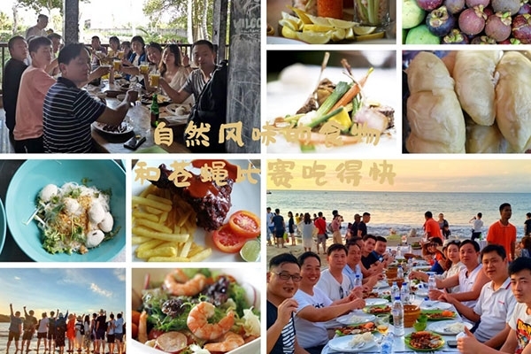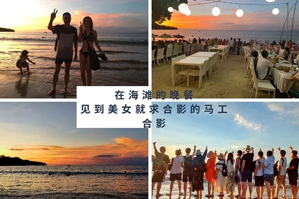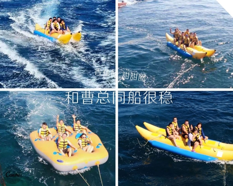 半小時后,我們首先到達了海中間由兩艘游輪搭建的漂浮“海上游玩基地”,除了“香蕉船”“甜甜圈”和“浮潛”這些項目,最有意思的是“跳海”,作為非專業隊員,大家入水姿勢各異,激起巨大的浪花。遺憾的是,“女神”曹總并沒有參與“跳海”,估計她是為大家著想,怕入水海平面升高2米,淹沒“基地”,多年以后,我還是要感謝曹總的“不淹之恩”,讓我依然可以坐在在夕陽下回憶往昔。