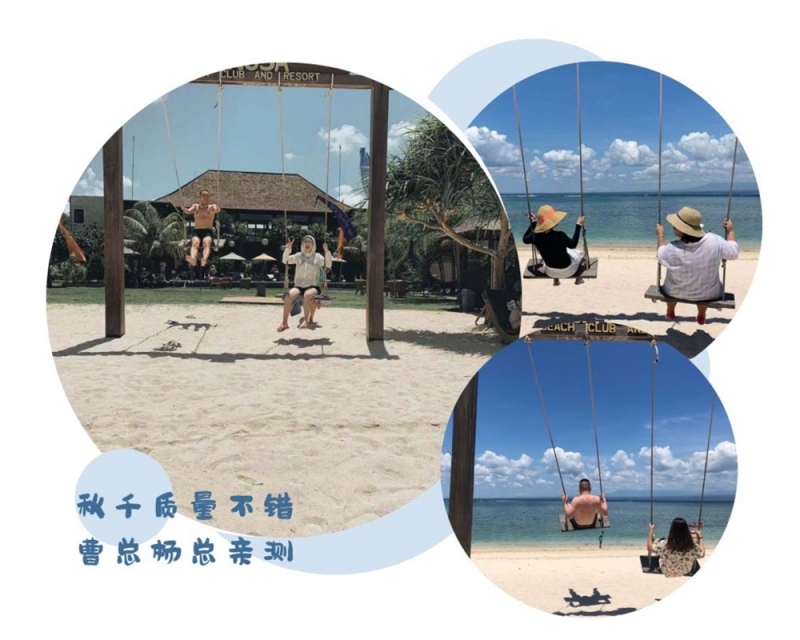 夢幻海灘的海水恐怕是巴厘島最清澈明凈的,海風如酒,海天蒼蒼,如鏡面的天空和海水。在海面上劃行“獨木舟”,宛如漂浮在澄澈的天空之境。而海灘上的秋千,面朝大海,大家爭相坐在秋千上拍照,經過曹總和楊總親自檢驗,證明雖然是木質秋千,但是質量誠不欺我。
