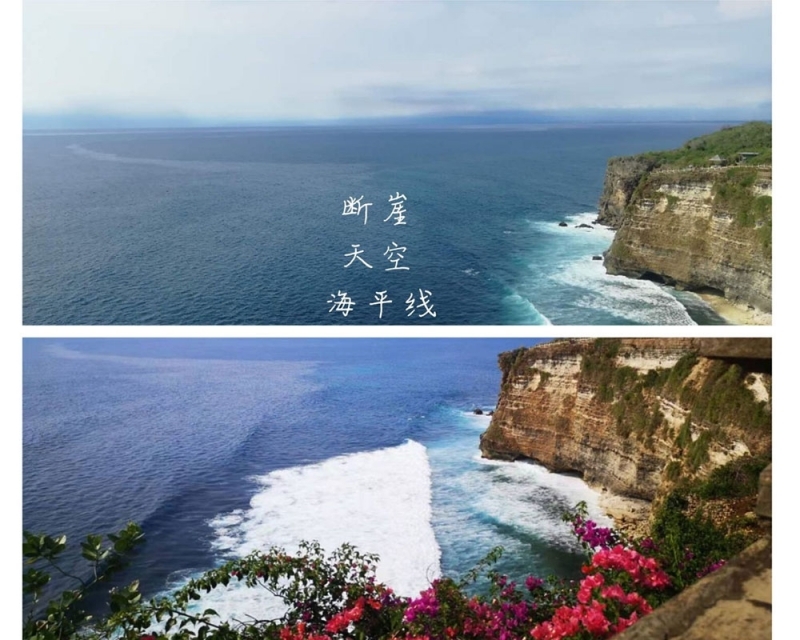 烏魯瓦圖斷崖位于巴厘島的最南端,是我們此行的最后一站,沿途的猴子據說會搶游客的帽子和眼鏡,讓我們一路有些忐忑,生怕遭遇這些“劫匪”。當我們終于站在斷崖的最高處,遠處海平線和天相接,海色融于天空,在別處很難看到如此開闊的海平線,頗為壯觀。而斷崖下水石相搏,浪花翻涌,又別是一番景致。大家紛紛駐足拍照,而見到金發美女就求合影的馬工更是沒有放過這個絕好的機會,和三位美女留影合照,熾烈的陽光下,馬工漆黑的膚色優勢仿佛也沒成功搶鏡。