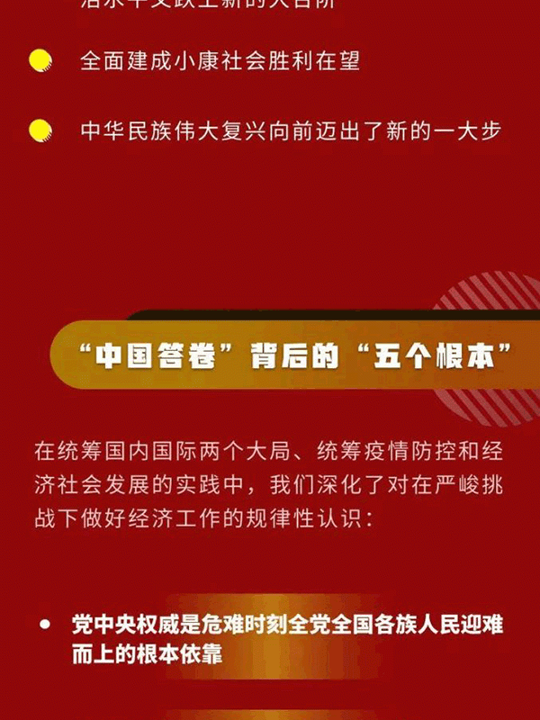 會議認為,今年是新中國歷史上極不平凡的一年。面對嚴峻復雜的國際形勢、艱巨繁重的國內改革發展穩定任務特別是新冠肺炎疫情的嚴重沖擊,我們保持戰略定力,準確判斷形勢,精心謀劃部署,果斷采取行動,付出艱苦努力,交出了一份人民滿意、世界矚目、可以載入史冊的答卷。我國成為全球唯一實現經濟正增長的主要經濟體,三大攻堅戰取得決定性成就,科技創新取得重大進展,改革開放實現重要突破,民生得到有力保障。這些成績來之不易,歷經艱難險阻,是以習近平同志為核心的黨中央堅強領導的結果,是全黨全軍全國各族人民團結奮戰的結果。