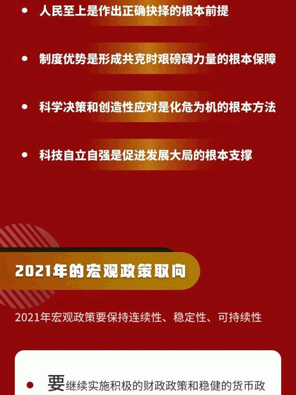 會議強調,明年是我國現代化建設進程中具有特殊重要性的一年。做好明年經濟工作,要以習近平新時代中國特色社會主義思想為指導,全面貫徹黨的十九大和十九屆二中、三中、四中、五中全會精神,堅持穩中求進工作總基調,立足新發展階段,貫徹新發展理念,構建新發展格局,以推動高質量發展為主題,以深化供給側結構性改革為主線,以改革創新為根本動力,以滿足人民日益增長的美好生活需要為根本目的,堅持系統觀念,鞏固拓展疫情防控和經濟社會發展成果,更好統籌發展和安全,扎實做好“六穩”工作、全面落實“六保”任務,科學精準實施宏觀政策,努力保持經濟運行在合理區間,堅持擴大內需戰略,強化科技戰略支撐,擴大高水平對外開放,確保“十四五”開好局,以優異成績慶祝建黨100周年。