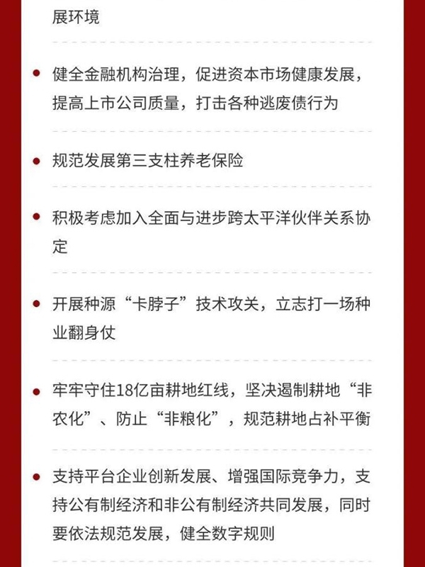 四是全面推進改革開放。構建新發展格局,必須構建高水平社會主義市場經濟體制,實行高水平對外開放,推動改革和開放相互促進。要完善宏觀經濟治理,加強國際宏觀政策協調。要深入實施國企改革三年行動,優化民營經濟發展環境,健全現代企業制度,完善公司治理,激發各類市場主體活力。要放寬市場準入,促進公平競爭,保護知識產權,建設統一大市場,營造市場化、法治化、國際化營商環境。要健全金融機構治理,促進資本市場健康發展,提高上市公司質量,打擊各種逃廢債行為。要規范發展第三支柱養老保險。要積極考慮加入全面與進步跨太平洋伙伴關系協定。要大力提升國內監管能力和水平,完善安全審查機制,重視運用國際通行規則維護國家安全。