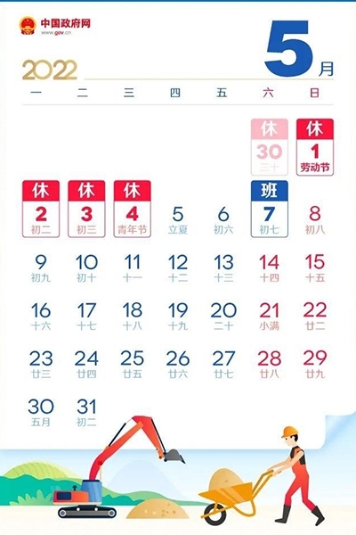 2022年4月30日-5月4日放假調(diào)休,共5天。5月7日(星期六)我們正常上班。節(jié)前各位同事安排好工作,配合行政做好清潔打掃工作,檢查好電源開關(guān),關(guān)好門窗。節(jié)日期間,請大家注意人身安全和財產(chǎn)安全,愉快的度過假期。